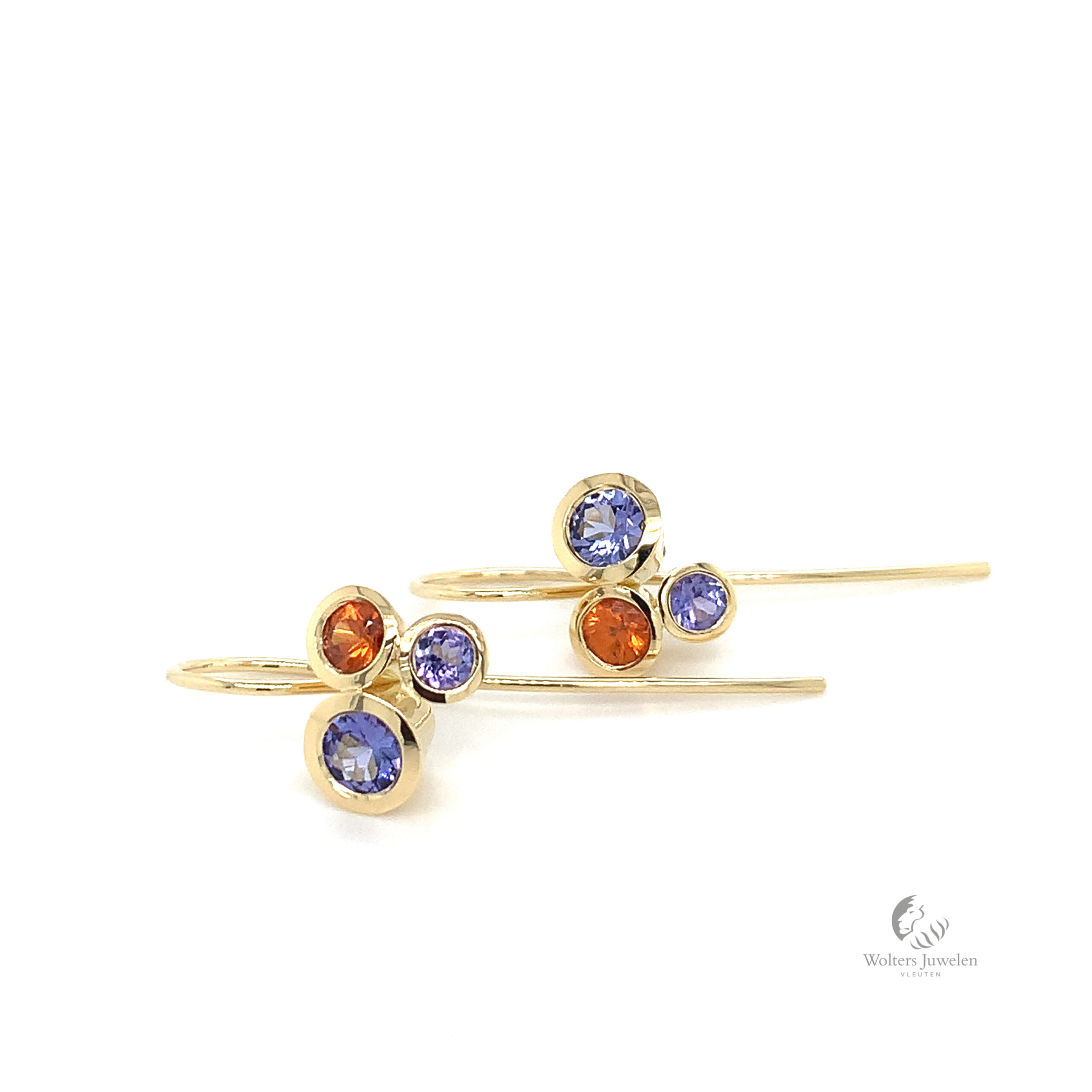 De oorhangers zijn vervaardigd in het 18 karaat geelgoud met facet geslepen Tanzaniet en Mandarijn Granaat.