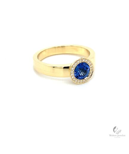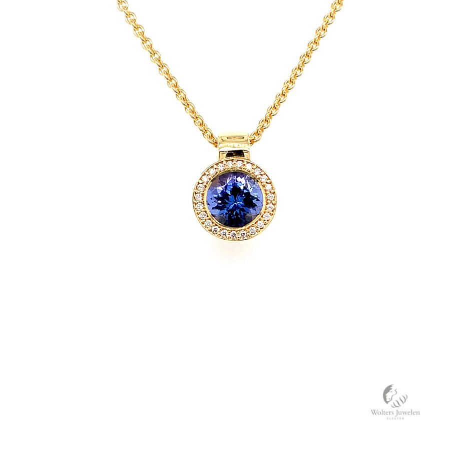 De hanger is gemaakt in het 18 karaat geelgoud met een Tanzaniet en briljant geslepen Diamanten.