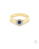 De ring is gemaakt in 18 karaat geelgoud met facet geslepen Saffier en daarom heen briljant geslepen witte Diamanten.