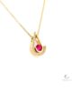 De hanger is gemaakt in 18 karaat geelgoud met een pave gezette Diamanten rand en met een sprankelende Robijn.