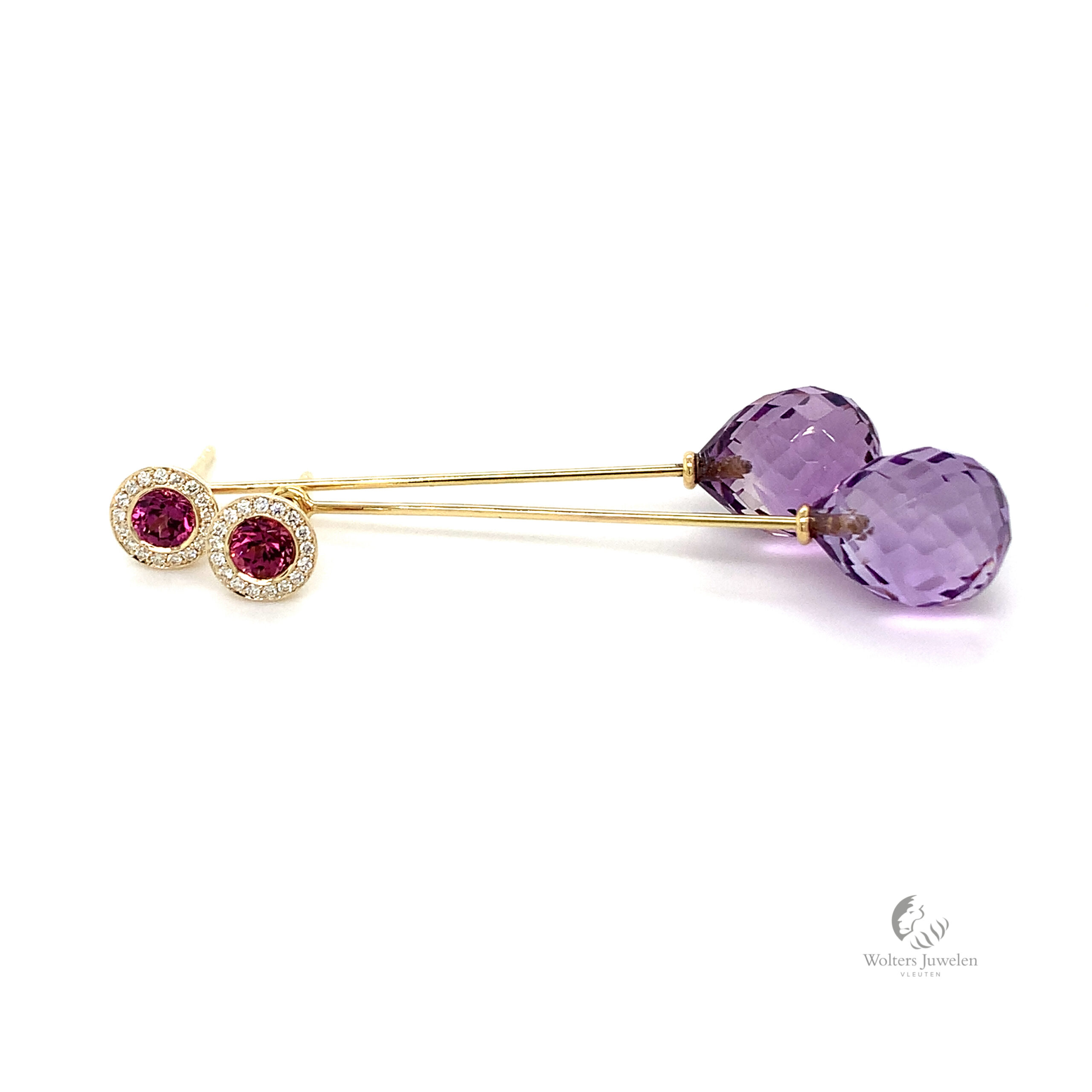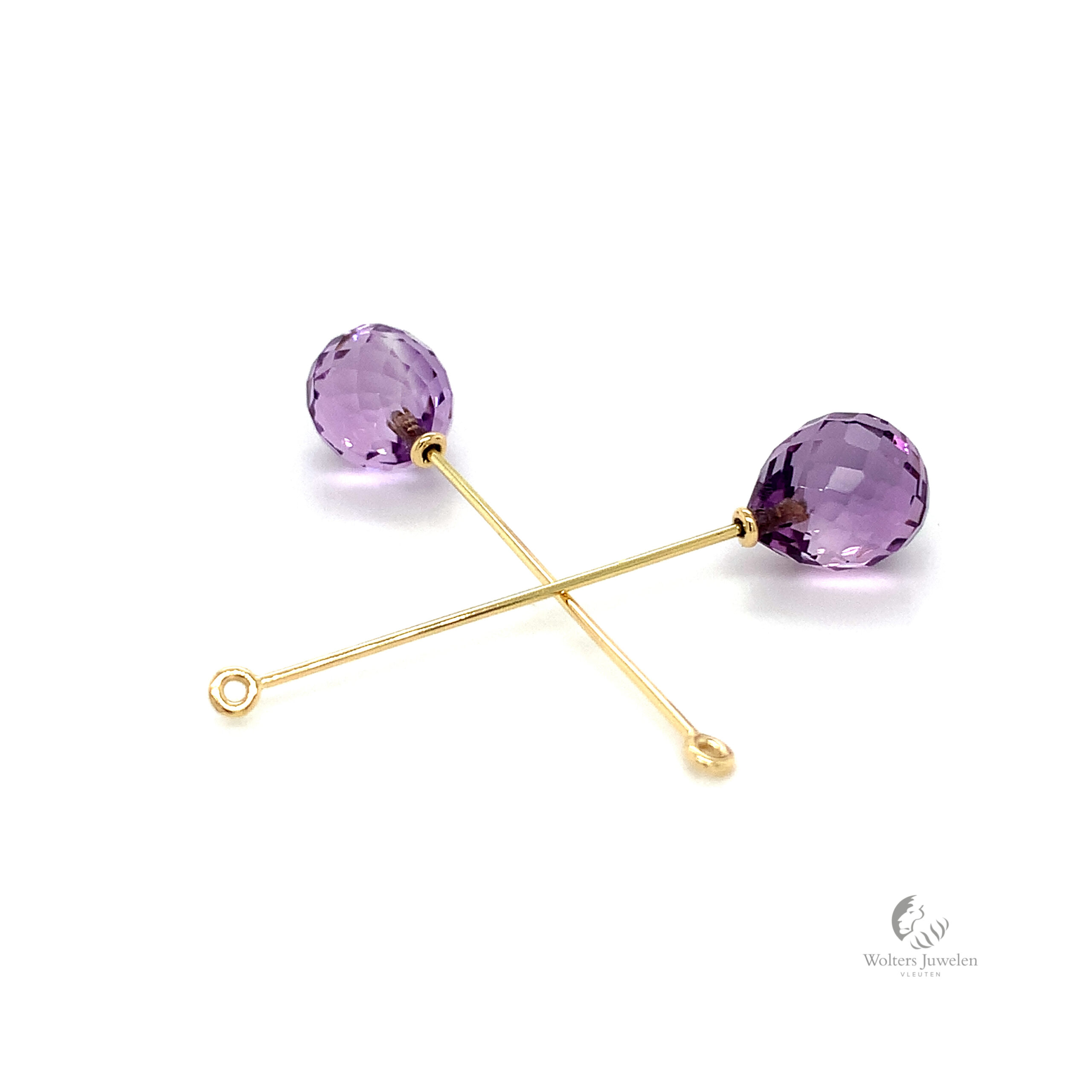 Deze unieke oorhangers zijn vervaardigd in het 18 karaat geelgoud met een pampel facet geslepen Amethist.