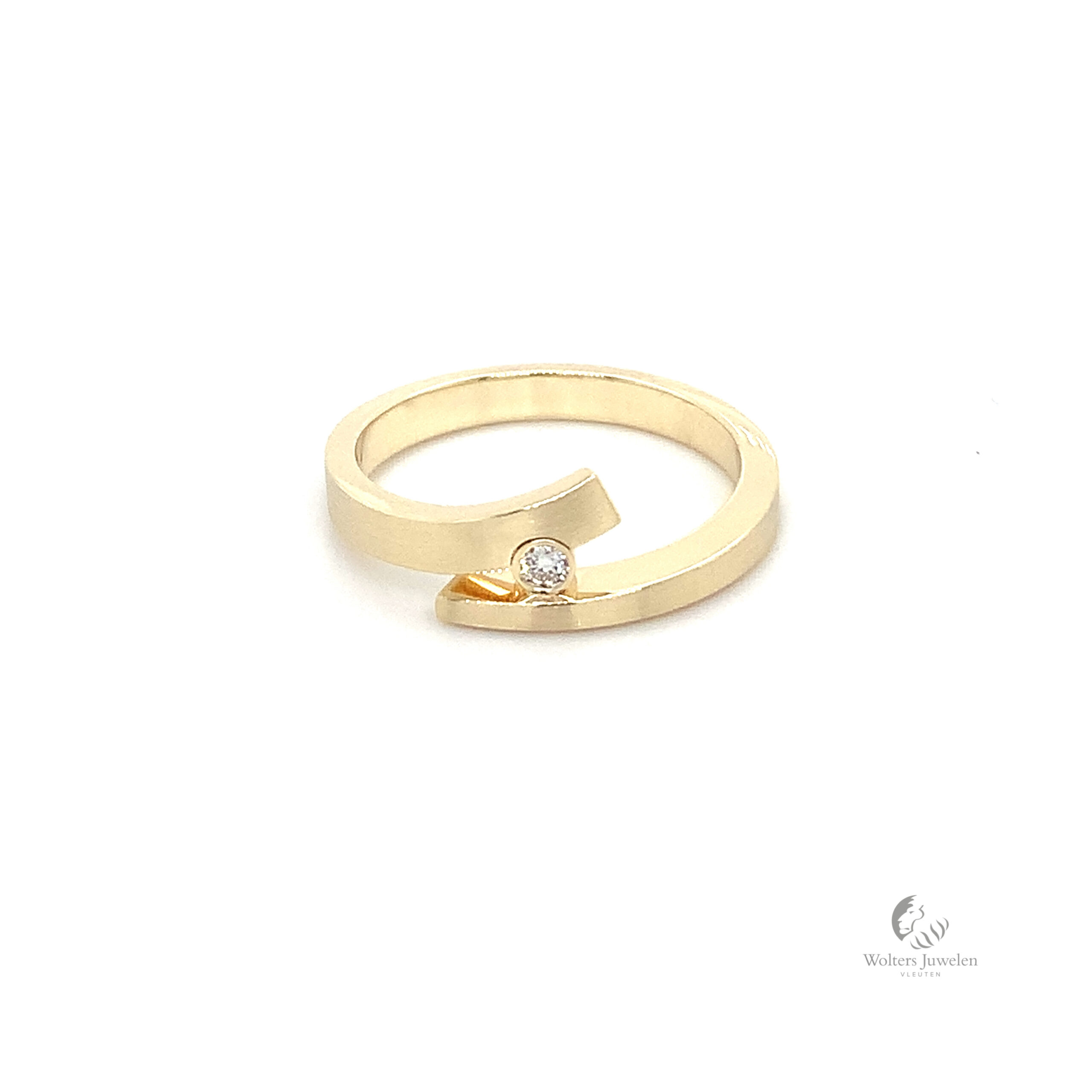 De ring is gemaakt in 14 karaat geelgoud met briljant geslepen Diamant.