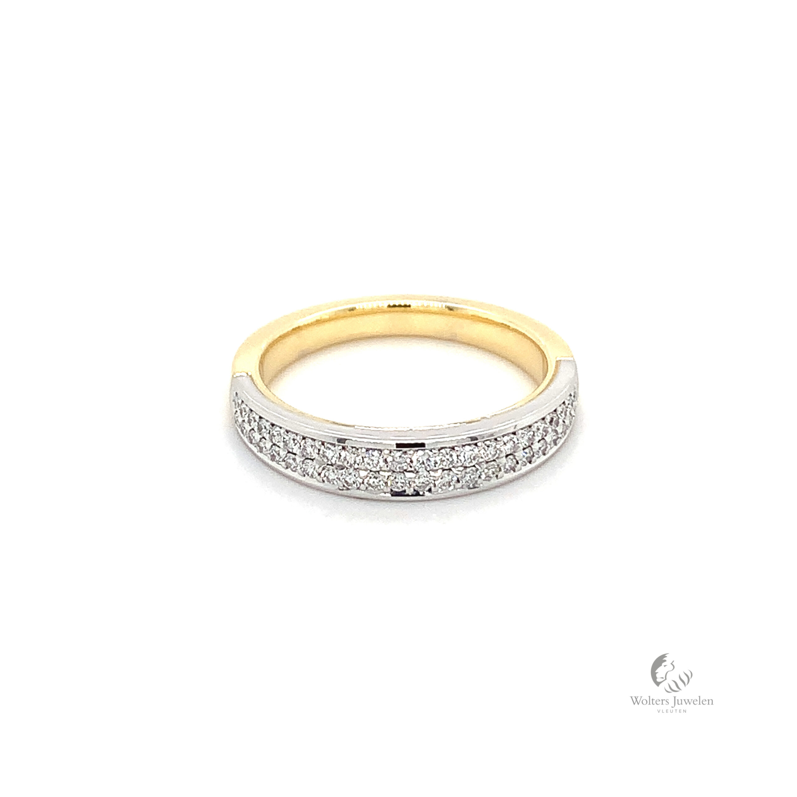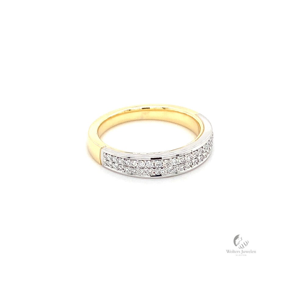 Deze unieke ring is gemaakt in 18 karaat geel en witgoud met pavé gezette Diamanten.